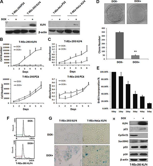 Figure 1: Overexpression of KLF4 induced cellular senescence in epithelial cells. (A) KLF4 expression in KLF4 inducible expression system. KLF4 inducible cell lines were treated with 2 μg/ml DOX for 24 hours, and KLF4 expression was detected by Western blotting. (B) Growth curves and (C) MTT assay of T-REx-293 KLF4 and T-REx-293 PC4 cells after DOX treatment for o to 6 days. Results represent means ± s.d (n = 3). (D) Colony formation assay of T-REx-293 KLF4 cells. Representative clone formation photos were presented and colony number was counted. Bars represent the mean ± SD (n = 3). **p < 0.01. (E) BrdU incorporation assay of T-REx-293 KLF4 cells. (F) Flow cytometry assay of T-REx-293 KLF4 cells with or without DOX for 72hrs. (G) Detection of senescence in KLF4 inducible cells. T-REx-293 KLF4 and T-REx-HeLa KLF4 cells were seeded into 6-well plates, three days after DOX treatment, cellular senescence was detected by SA-β-Gal staining assay. Bars represent the mean ± SD of three independent experiments. (H) Western blotting analysis of senescence related protein in T-REx-293 KLF4 cells with or without DOX treatment for 3 days.