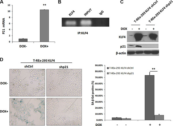 Figure 2: p21 expression increased in KLF4-induced senescence. (A) p21 mRNA detected by Real-time PCR. T-REx-293 KLF4 cells were treated with DOX for 72 h and harvested for RNA extraction. Bars represent the mean ± SD (n = 3). **p < 0.01. (B) PCR result of KLF4 binding site of p21 gene promoter pulled down by ChIP. T-REx-293 KLF4 treated with DOX for 72 h were harvested and subjected to immunoprecipitation with either anti-KLF4 antibody or mouse IgG. Input DNA was applied as a positive control, and immunoprecipitation of IgG as a negative control. (C) p21 expression detected by Western blotting. T-REx-293 cells were transfected with shp21 and shCtrl plasmids and harvested after 72 h. (D) Representative SA-β-gal staining photos(magnification 100×) and percentage of senescence cells. Bars represent the mean ± SD (n = 3). **p < 0.01.