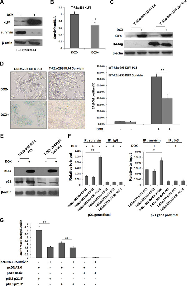 Figure 3: Survivin was involved in KLF4-induced senescence. (A) Expression of survivin protein and (B) mRNA with or without DOX treatment of T-REx-293 KLF4 cells. Bars represent the mean ± SD (n = 3). *p < 0.05.(C) Expression of exogenous survivin detected by Western blotting. (D) Representative SA-β-gal staining photos and percentage of senescence cells. Bars represent the mean ± SD (n = 3). **p < 0.01. (E) Western blotting analysis of p21 in T-REx-293 KLF4 Survivin and T-REx-293 KLF4 PC3 cells. (F) Quantitative PCR analysis of direct binding of survivin to p53 distal (left) or proximal (right) binding site of p21 gene promoter. Anti-survivin antibodies were used for immunoprecipitation. Input DNA was used as internal control for quantification, and immunoprecipitation of IgG as negative control. Bars represent the mean ± SD of two independent experiments. *p < 0.05, **p < 0.01. (G) Reporter assay of p21 promoter region. T-REx-293 cells were transfected with pcDNA3.0 HA-Survivin or pcDNA 3.0 plasmids, pGL3 Basic, pGL3 p21 plasmids, and pRL-TK plasmids and assayed for p21 luciferase activities. Firefly/ Renilla luciferase ratios were used to calculate fold induction. All experiments were performed in triplicated. **p < 0.01.
