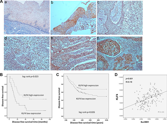 Slides were probed with anti-KLF4 antibody (1:100, Santa Cruz) and assessed by two individual investigators. KLF4 immunoreactivity was scored 0~3 by the color and percentage of cells showing distinct nuclear and/or diffuse cytoplasmic immunohistochemical reaction. Scores of 0~1 were defined as “low expression”, and scores of 2~3 as “high expression”.