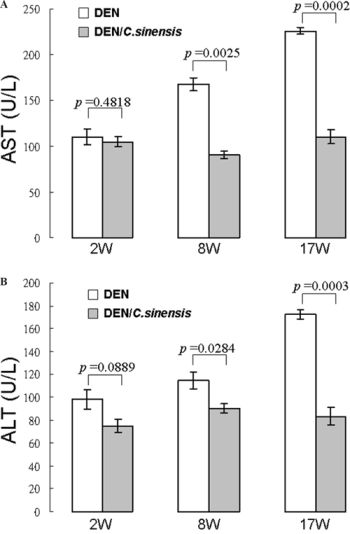 As depicted in Figures 2A and 2B, serum AST and ALT activities were significantly promoted under DEN exposure compared with the healthy reference values, indicating that DEN caused severe hepatic cell injury. Treatment with C. sinensis almost completely abolished the increase of serum ALT and AST activities at 17 weeks, suggesting that C. sinensis could effectively inhibit DEN-induced liver cell damage.