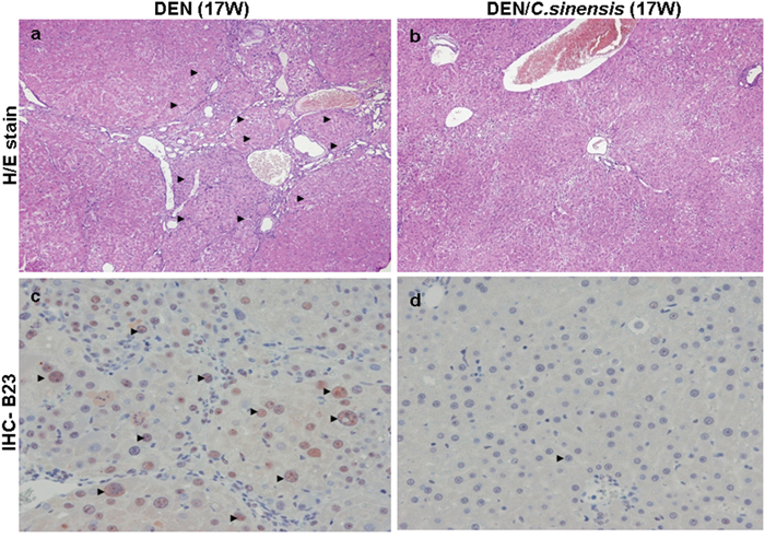 Figure 3: Histologic examination of rat liver at 17 week (17 W) by hematoxylin and eosin (H/E) staining and immunohistochemical staining for a. & c. DEN-treated group, b. & d. DEN/C. sinensis-treated group. The regions with differently expressed B23 were indicated by black arrows. Original magnification: 200×.