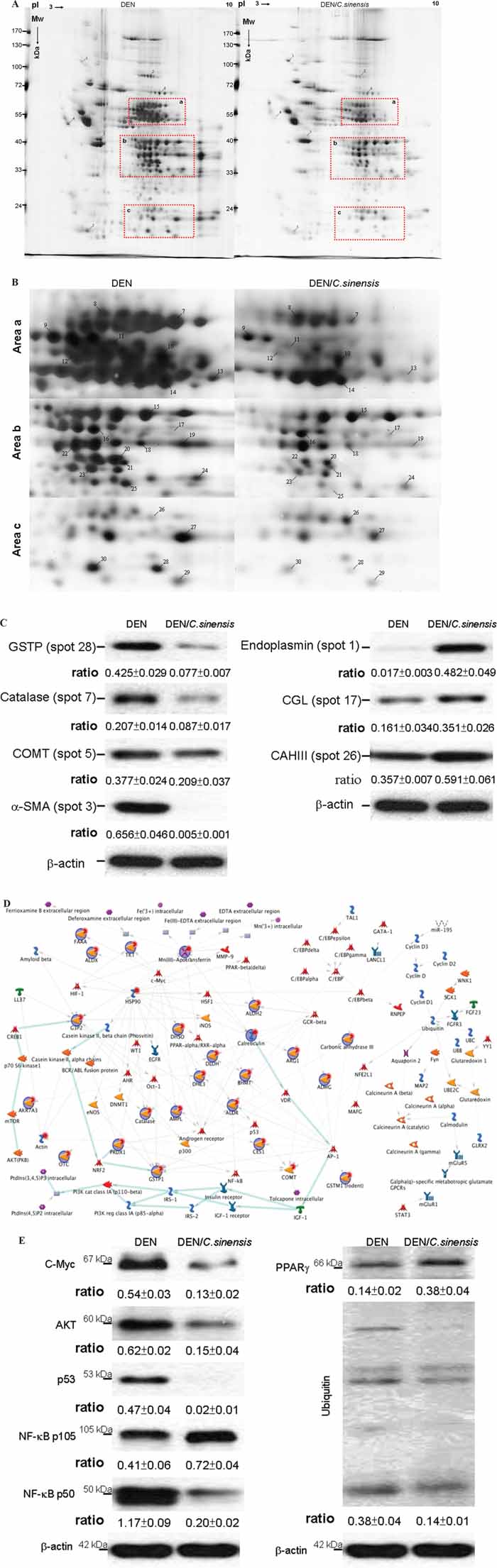 Diethylnitrosamine (DEN) is a component of tobacco smoke, fried foods, cheese, and a number of alcoholic beverages. The formation of alkyl DNA adducts, by which (8-hydroxy-2’-deoxyguanosine (8-OHdG)) consequently blocks replication, has been considered the predominant factor in DEN-mediated tumorigenesis [16]. In addition, the administration of DEN was proven to enhance the formation of the activated oxygen species in the preneoplastic nodules in the liver [17]. In the present study, DEN-induced hepatocellular carcinoma in a rat model has been used to reveal the molecular mechanisms by which C. sinensis might prevent the growth of human hepatocellular carcinoma. Carcinogenesis is a multistep process involved in complicated protein changes in response to environmental cues. We used two-dimensional (2-DE) gel electrophoresis combined with MALDI-TOF identification and network analysis to thoroughly delineate the differential protein profiles as well as the signaling pathways.