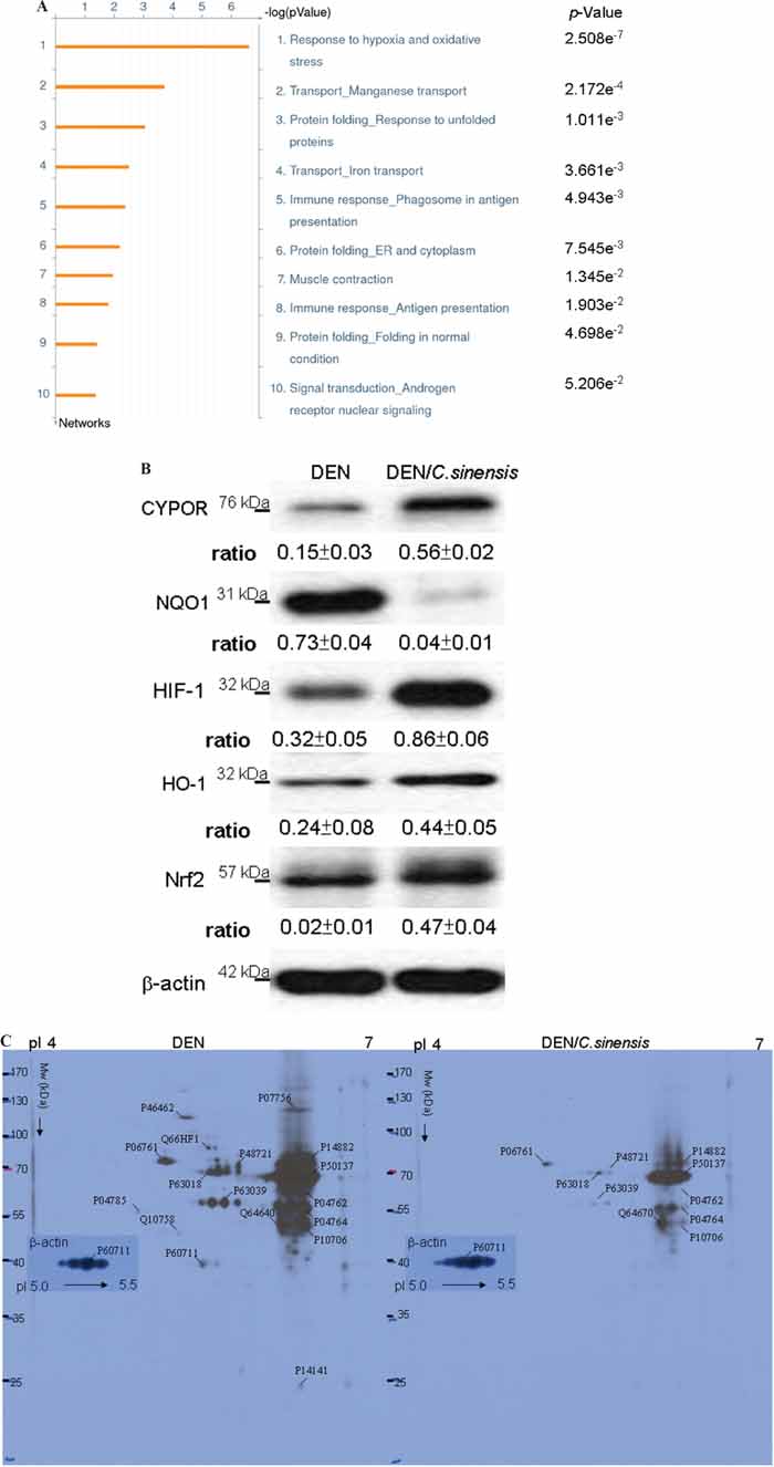 Meanwhile, DEN treatment disturbs the normal redox balance and shifts hepatocytes into a state of highly oxidative stress, which induces the carbonylation of specific groups of proteins involved in the progression of liver tumors [18, 19]. The most widely studied oxidative stress–induced modification of proteins is the formation of carbonyl groups that can react with 2,4-dinitrophenylhydrazine (DNP) and are detected by specific antibodies [20, 21]. We applied redox proteomics to prove our hypothesis concerning the anti-tumor effect of C. sinensis. These tools allow us to investigate the proteins involved in the multiple signaling cascades of the living cell, and to provide an unbiased approach to uncover new players controlling cell function, especially in tumor carcinogenesis and therapy [22, 23].