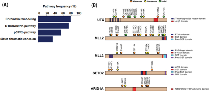 Figure 2: A. Pathway enrichment analysis of mutated genes. B. The locations of somatic mutations in chromatin remodeling genes that had frequencies ≥ 10%.