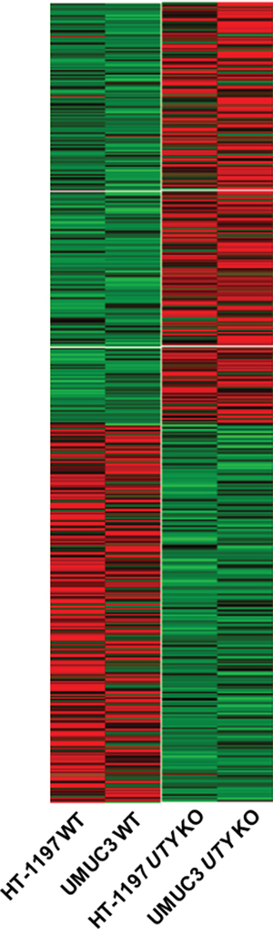 Figure 4: Changes in expression patterns in UBC cell lines after UTY knock-out. Differentially expressed genes that exhibited the same trends (up/down-regulation) in both cell lines are shown in the heat map.