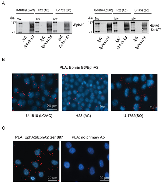 By immunoprecipitation we indeed found that Ephrin B3 binds to EphA2 in NSCLC cells (Figure 3A, left panel). The interactions between Ephrin B3 and EphA2 in NSCLC cells were also validated by proximity ligation assay (PLA) in situ (Figure 3B). Ephrin B3 and EphA2 showed a clear association as indicated by the PLA signals, albeit different magnitudes of interaction were seen among the analyzed NSCLC cell lines (Figure 3B). Interestingly, immunoprecipitation of Ephrin B3 also pulled down Ser897- phosphorylated EphA2 (Figure 3A, right panel), indicating that Ephrin B3 may indeed constitute an EphA2 ligand that can enable EphA2 to stay phosphorylated on this site. Accordingly PLA confirmed Ser897 phosphorylation in NSCLC U-1810 cells (Figure 3C). Moreover, western blot analyses revealed prominent EphA2 Ser897 in several NSCLC cell lines indicating the existence of a functional Ephrin B3/EphA2 signaling loop in NSCLC cells (Figure 3D).