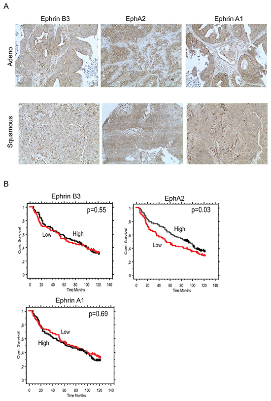 Figure 5: Concomitant Ephrin B3, Ephrin A1 and EphA2 expression in NSCLC clinical specimens. Ephrin B3, Ephrin A1 and EphA2 expression levels and their relation to patient overall survival (OS) was analyzed in a cohort of Stage IA-Stage IB NSCLC specimen using immunohistochemistry. A. Examples of Ephrin B3, EphA2 and Ephrin A1 staining in adenocarcinoma and squamous cell carcinoma NSCLC specimens. 20x magnification. B. Kaplan-Maier curves showing the association between Ephrin B3, EphA2 and Ephrin A1 expression intensity levels and OS in the NSCLC patient cohort. Red line: Low score, black line: High score. Wilcoxon test was used for statistical assessment and the p-values are indicated.