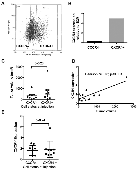 Figure 1: Ewing sarcoma cells transition between CXCR4 negative and positive states in vivo. A. FACS-sorting of TC-32 cells on the basis of cell surface CXCR4 prior to injection into tail veins of NOD-SCID mice. B. FACS-sorting generated cell populations with differential expression of CXCR4 transcript as determined by qRT-PCR. C. Tumors were excised at necropsy and volumes determined. Nine tumors were analyzed in each group (from 5 CXCR4 negative and 8 CXCR4 positive recipient mice). D. A direct correlation was observed between CXCR4 expression, as determined by qRT-PCR, and tumor volume in excised tumors. E. CXCR4 expression in tumors at the time of necropsy as determined by qRT-PCR. Expression of CXCR4 was highly variable. Mean expression was equivalent between the two groups.