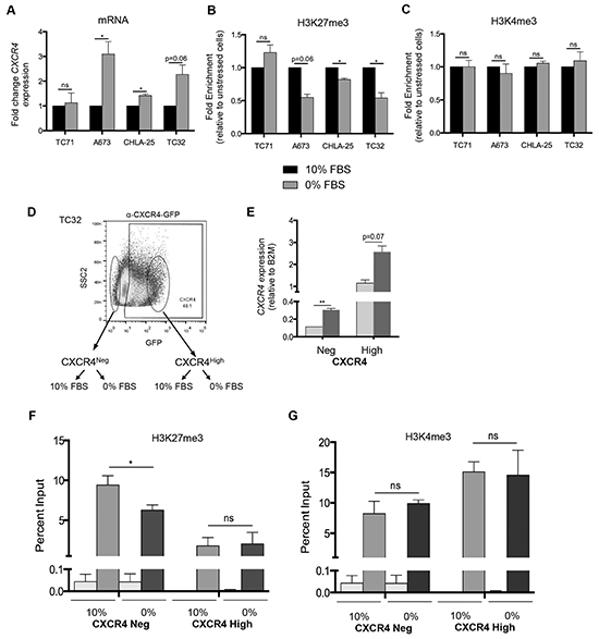 Figure 6: Ewing sarcoma cells lose the repressive H3K27me3 mark at the CXCR4 promoter in response to stress. A. qRT-PCR shows that serum starvation resulted in upregulated expression of CXCR4 expression in three of four Ewing sarcoma cell lines. B. CHIP-qPCR confirmed diminished H3K27me3 enrichment at the CXCR4 promoter in cells with upregulated transcript expression. C. No change in H3K4me3 enrichment was induced by serum deprivation. D. TC32 cells were FACS-sorted to isolate CXCR4 negative cells which were then placed into 10% FBS or serum deprived conditions for 24 hours. E. CXCR4 mRNA expression was induced by serum deprivation in CXCR4 negative (p<0.005) and also in CXCR4 positive cells (p=0.07) F. Loss of H3K27me3 was evident in CXCR4 negative but not CXCR4 positive cells following serum deprivation. G. Serum withdrawal had no impact on H3K4me3 enrichment at the CXCR4 promoter in either CXCR4 negative or CXCR4 positive cells. Data are represented as mean ± SEM (n=3 for CXCR4 expression, n=2 or 3 for ChIP experiments). *. P <0.05 ** P <0.005 as compared to controls.