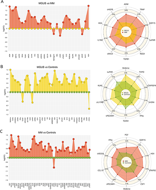 To assess the serum protein fingerprints associated with MGUS and MM, we compared serum protein pattern obtained by PEA immunoassay in MGUS and MM and healthy controls. Of ninety-two analyzed biomarkers (Supplementary Table S1), levels of six biomarkers (sBTC, CA242, sER, GM-CSF, IL2, IL4) were below the Proseek limit of detection (LOD) in all studied groups and were therefore excluded from further analysis. Comparing MGUS and MM, 26 analytes were deregulated between these groups, whereas 13 analytes reached the significance after the adjustment for multiple comparisons (Supplementary Table S2A). The distribution of serum levels of top-ranked proteins (ADM, TRAP, GDF15, suPAR, REG4, TGFB1, sMICA, IL1RA, HE4, sHGFR, sVEGFA; see Table 1A), all found upregulated in MM, is shown in Figure 1. The protein serum fingerprints associated with MGUS and MM and the changes in protein levels between MGUS and MM for top-deregulated analytes are shown in Figure 2A.