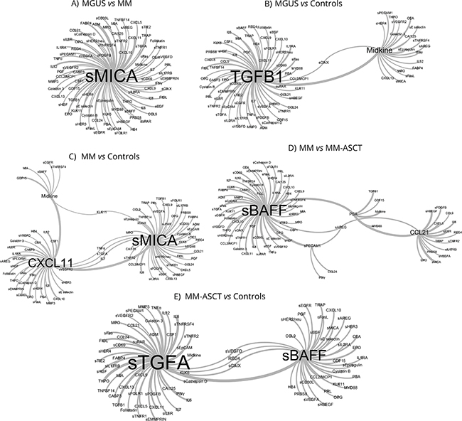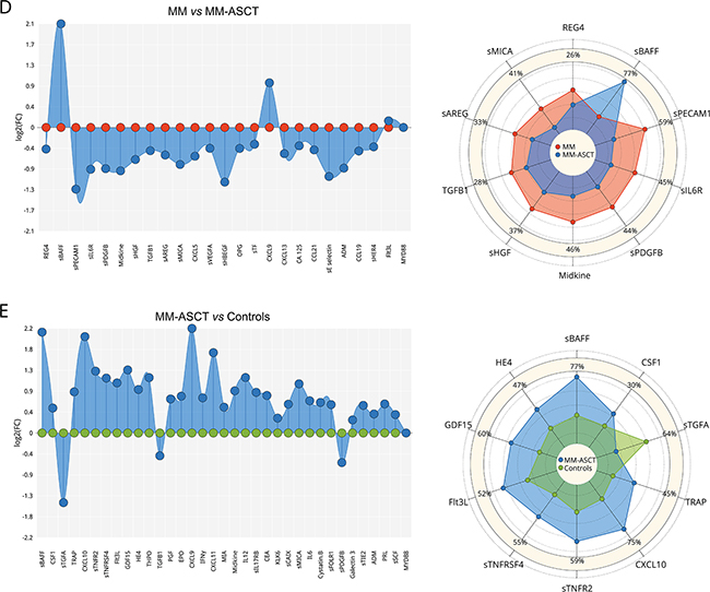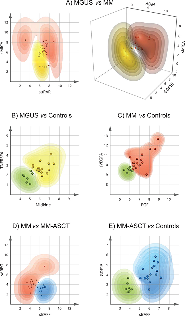 Table 1: Serum levels of top-ranked proteins differentiating between A) MGUS vs MM, B) healthy controls vs MGUS, C) healthy controls vs MM, D) MM vs MM-ASCT and E) healthy controls vs MM-ASCT.