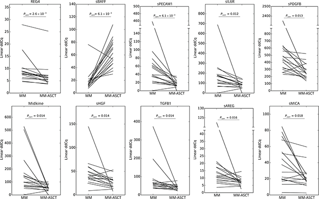 Given the key role of cytokines and growth factors in MM pathogenesis, we investigated the complexity of serum microenvironment using novel multiplex highly-sensitive PEA immunoassay on 92 cancer-related proteins followed by pattern-recognition analyses. Besides identification of serum fingerprints distinguishing MGUS and MM, we for the first time compared paired MM samples from the time of diagnosis and after autologous stem cell transplantation (MM-ASCT) as well as MGUS to healthy subjects.