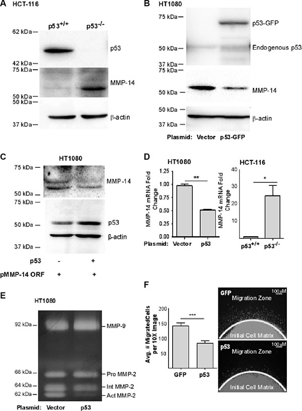 Figure 1: p53 expression is inversely correlated with MMP-14 levels. (A) Western blotting was performed in p53 wild-type (p53+/+) and p53 null (p53−/−) HCT-116 cells using anti-p53 and anti-MMP-14 antibodies. β-actin was used as a loading control. MMP-14 was only detected in p53−/− HCT-116 cells, but not in p53+/+ HCT116 cells. (B) Ectopic expression of p53-GFP in HT-1080 cells results in a decrease of MMP-14 levels as demonstrated by Western blotting analysis using anti-p53, anti-MMP-14 antibodies. β-actin was used as a loading control. (C) Co-expression of MMP-14 cDNA encoding the open reading frame of MMP-14 driven by its native promoter (pMMP-14 ORF) with p53 cDNA leads to decreased MMP-14 expression compared to vector control when examined by a Western blotting using corresponding antibodies. β-actin was used as a loading control. (D) Total RNA extracted from HT-1080 cells transfected with p53 or control cDNA and p53+/+ and p53–/– HCT-116 cells was examined by real time RT-PCR using MMP-14 primers. HPRT-1 was used as a normalization control. An inverse correlation between p53 expression and MMP-14 levels was observed in gene transcriptional levels. (E) Gelatin zymography was employed to examine functional MMP-14 in terms of proMMP-2 activation. Ectopic expression of p53 in HT-1080 cells attenuates MMP-14-mediated proMMP-2 activation. proMMP-2: latent form of MMP-2; IntMMP-2: intermediate form of MMP-2; and act MMP-2: fully activated MMP-2. (F) Dot migration assay was conducted to examine the effect of p53 on cancer cell migration. HT1080 cells transfected with vector control and p53 cDNA were mixed with collagen type I and dotted onto a 96-well plate. After a 24 hours incubation, the cells were fixed and stained with DAPI for nuclear staining (right panel) followed by microscopic counting of migrated cells (left panel). *p < 0.05, **p < 0.01, ***p < 0.001.