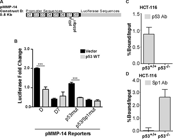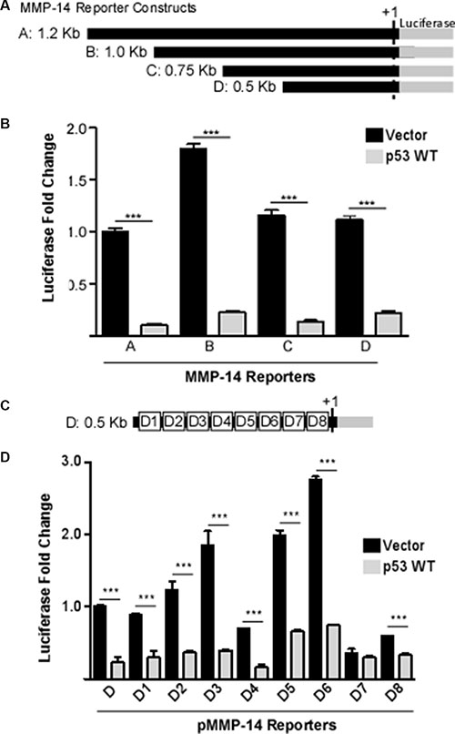 Figure 2: Identification of p53 response element with the MMP-14 promoter. (A) A schematic diagram of the full length and truncated MMP-14 promoters termed truncation A through D. (B) Co-transfection of p53 cDNA with pMMP-14-Luc demonstrates by luciferase assay that p53 decreases MMP-14 promoter induction. As the shortest truncation, truncation D, also has decreased promoter induction by p53 compared to vector control, region D is determined to contain the p53 regulatory response element. Renilla luciferase was used as a normalization control. (C) A schematic diagram of deletion mutants of approximately 50 bp within the region D. (D) Co-expression of p53 cDNA with pMMP-14-Luc at deletion 7 no longer attenuates promoter induction compared to vector control, indicating D7 contains the p53 regulatory response element. Renilla luciferase was used as a normalization control. ***p < 0.001.
