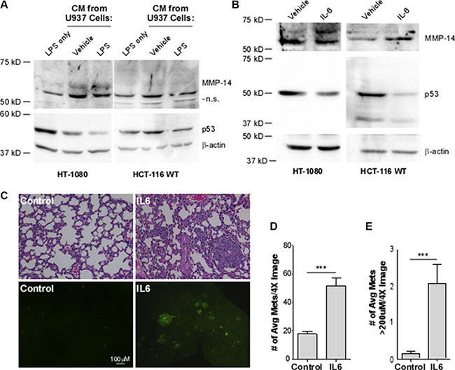 Figure 4: Interleukin-6 decreases p53 levels, leading to a concomitant increase in MMP-14 expression in HT-1080 and HCT-116 WT cells and drives metastasis and growth of HT-1080 cancer cells in vivo. (A) Western blotting analysis was performed on HT-1080 and HCT-116 p53 wild type (WT) cells in the presence of LPS or with conditioned media (CM) from U937 macrophage cells that were activated with LPS to induce cytokine secretion or with water as vehicle control for 24 hours. While CM from U937 cells increase MMP-14 levels, only after macrophage activation was a decrease in p53 observed using anti-p53 and anti-MMP-14 antibodies. β-actin was used as a loading control. (B) Western blotting analysis was performed on HT-1080 and HCT-116 cells treated with 50 ng/mL recombinant IL-6 or 1% BSA vehicle control for 24 hours followed by Western blotting. A decrease in p53 was observed along with a concomitant increase in endogenous MMP-14 using the corresponding antibodies. β-actin was used as a loading control. (C) H&E staining of paraffin-embedded sectioned lung tissue sections (top panel) and the presence of GFP lesions on the gross lung tissue (bottom panel) indicates increased formation of metastases. The number (D) and size (E) of GFP-positive lesions per image are significantly increased in mice which received IL-6-treated cells (n = 9) compared to control (n = 10). Lesion size was determined using Nikon Imaging Software. ***p < 0.001.
