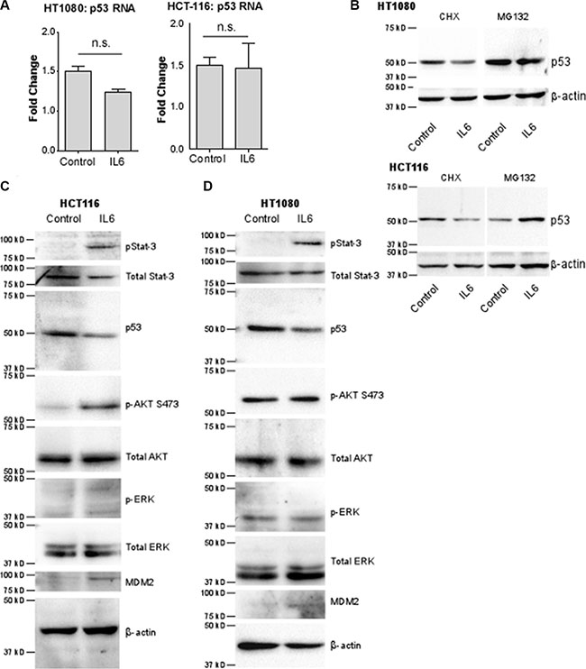 Figure 5: The decrease of p53 by IL-6 is due to increased rate of degradation by E3 ubiquitin ligase MDM2 via cell-specific signaling pathways. (A) p53 mRNA levels normalized to HPRT-1 were analyzed by real time RT-PCR. p53 mRNA levels do not significantly change in either HT-1080 or HCT-116 cells after stimulation with IL-6. (B) Western blotting of HT-1080 and HCT-116 cells using an anti-p53 antibody demonstrates that inhibition of protein synthesis by 20 ug/mL cycloheximide (CHX) in both cells lines has no effect on the decrease in p53 protein stimulated by IL-6. However inhibition of proteasomal degradation by 10 uM MG-132 completely blocks downregulation of p53 and stabilizes p53 protein levels, indicating IL-6 regulates p53 levels by increasing its degradation. β-actin was used as a loading control.(C) In HCT-116 cells, IL-6 stimulation activates p-Stat3 and p-AKT pathways compared to vehicle control. Furthermore, MDM2 levels are increased whereas p53 levels are decreased as evidenced by western blotting using the corresponding antibodies. The MAP-K pathway is not activated by IL-6, as evidenced by the lack of ERK 1/2 phosphorylation in response to IL-6. (D) In HT-1080 cells were treated as in C and analyzed by Western blotting. In this cell line, the p-Stat3 pathway only is activated, leading to increased MDM2 levels and decreased p53 levels.
