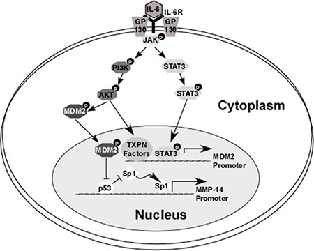 Figure 7: Overview of the mechanism by which IL-6 downregulates p53, leading to increased MMP-14-expression. IL-6 binds to its receptor which then forms a complex with GP130. This leads to activation of JAK kinase, which in turn activates STAT3 and AKT (via the PI3K pathway). Phosphorylation of STAT3 leads to translocation of this molecule to the nucleus where it serves as a transcription factor and induces expression of E3 ubiquitin ligase MDM2. Similarly, IL-6-induced phosphorylation of AKT in HCT-116 (but not HT-1080) cells leads to increased expression of MDM2 levels. Furthermore, p-AKT induces the translocation of cytosolic MDM2 molecules to the nucleus. A primary target of MDM2 is p53; ubiquitination and subsequent degradation of p53 at the MMP-14 promoter allows for transcription factor Sp1 to bind to the MMP-14 gene and increase its expression.