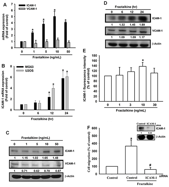 Figure 2: Fractalkine-induced cell migration is mediated by ICAM-1 expression in osteosarcoma. A. MG63 cells were treated with various concentrations of fractalkine for 24 h. Total RNA was extracted, and ICAM-1 mRNA expression was measured using qPCR. B. The osteosarcoma cell lines MG63 and U2OS were incubated with 10 ng/mL fractalkine for the indicated times. ICAM-1 mRNA expression was measured using qPCR. C. MG63 cells were treated as indicated (Figure 2A), and total protein was collected. VCAM-1 and ICAM-1 expression levels were assessed using Western blotting. D. MG63 cells were treated as indicated (Figure 2B), and total protein was collected. The VCAM-1 and ICAM-1 expression levels were assessed using Western blotting. E. MG63 cells were treated with the indicated concentrations of fractalkine for 24 h. The cells were stained with the ICAM-1 antibody and FITC-conjugated secondary antibody, and ICAM-1 expression was assessed using flow cytometric analysis. F. MG63 cells were transfected with ICAM-1 or negative siRNA (control) for 24 h and subsequently incubated with fractalkine (10 ng/mL) for 24 h. Cell migration ability was analyzed using the Transwell assay. The upper panel shows the expression of ICAM-1 in siRNA-transfected cells. Results are expressed as the mean ± SEM of triplicate samples. *P < 0.05 compared with the control group and #P < 0.05 compared with the fractalkine-treated group.