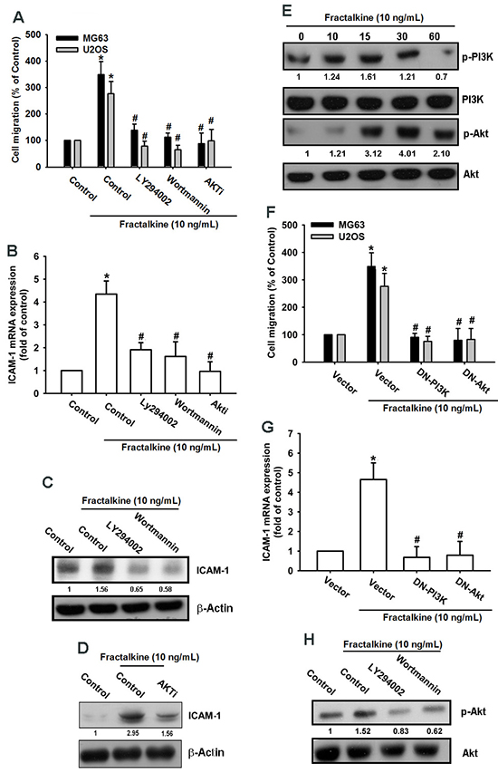 Figure 3: PI3K/Akt signal cascade mediates fractalkine response in human osteosarcoma. A. The osteosarcoma cell lines MG63 and U2OS were pretreated with 0.1% DMSO as a control, LY294002 (1 μM), wortmannin (1 μM), and Akti (1 μM) for 30 min and then incubated with fractalkine for 24 h. Cell migration was examined using the Transwell assay. B. MG63 cells were treated as described (Figure 3A), and ICAM-1 mRNA expression was assessed using qPCR. C and D. MG63 cells were pretreated with 0.1% DMSO as a control, LY294002 (1 μM), wortmannin (1 μM), or Akti (1 μM) for 30 min and then incubated with fractalkine for 24 h. ICAM-1 protein expression was examined using Western blotting. E. MG63 cells were incubated with fractalkine (10 ng/mL) for the indicated time intervals. Phosphorylation of PI3K and Akt was examined using Western blotting. F. The osteosarcoma cell lines MG63 and U2OS were transfected with the vector control and PI3K and Akt dominant mutants (DNs) for 24 h and subsequently treated with fractalkine (10 ng/mL) for 24 h, and cell migration was analyzed using the Transwell assay. G. MG63 cells were treated as described (Figure 3F), and ICAM-1 mRNA expression was assessed using qPCR. H. MG63 cells were pretreated with 0.1% DMSO as a control, LY294002 (1 μM), and wortmannin (1 μM) for 30 min and then incubated with fractalkine for 30 min. Akt phosphorylation was examined using Western blotting. Results are expressed as the mean ± SEM of triplicate samples. *P < 0.05 compared with the control group and #P < 0.05 compared with the fractalkine-treated group.