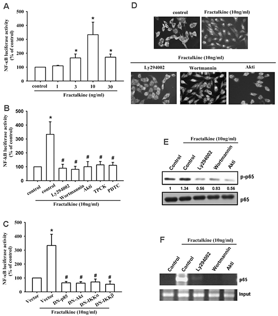 Figure 5: Fractalkine activates PI3K/Akt/NF-κB signal cascade in osteosarcoma. A. MG63 cells were transfected with the NF-κB promoter reporter plasmid for 24 h and then incubated with the indicated doses of fractalkine for 24 h, and luciferase activity was measured. B. MG63 cells were transfected with the NF-κB promoter reporter plasmid for 24 h. Subsequently, the cells were pretreated with 0.1% DMSO as a control, LY294002 (1 μM), wortmannin (1 μM), Akti (1 μM), PDTC (10 μM), and TPCK (1 μM) for 30 min and then incubated with fractalkine (10 ng/mL) for 24 h, and luciferase activity was measured. C. MG63 cells were cotransfected with the NF-κB promoter reporter plasmid and p85, Akt, IKKα, and IKKβ dominant mutants for 24 h and then incubated with fractalkine (10 ng/mL) for 24 h, and luciferase activity was measured. D. MG63 cells were pretreated with 0.1% DMSO as a control, LY294002 (1 μM), wortmannin (1 μM), and Akti (1 μM) for 30 min and subsequently incubated with fractalkine (10 ng/mL) for 60 min. Cells were stained with the anti-p65 antibody and analyzed using fluorescence microscopy. Nuclei were counterstained with DAPI. Representative confocal microscopy images are shown. E and F. MG63 cells were treated as indicted (Figure 5D), the nuclear extracts were prepared, and phosphorylation of p65 was determined through Western blot analysis (E), or chromatin immunoprecipitation was performed with anti-p65. One percent of immunoprecipitated chromatin was assayed to verify equal loading (input) (F). Results are expressed as the mean ± SEM of triplicate samples. *P < 0.05 compared with the control group and #P < 0.05 compared with the fractalkine-treated group.