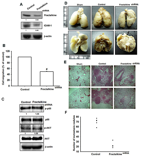 Figure 6: Knockdown of fractalkine inhibits cell migration ability and lung metastasis in osteosarcoma. A. Total protein was collected from MG63 cells stably expressing fractalkine shRNA. A vector-only control is also shown (control). Western blotting was used to assess the expression of fractalkine and ICAM-1. Actin was used as the loading control. B. The cell migration ability of MG63 cells stably expressing a shRNA vector and control vector was measured using the Transwell assay. C. The protein levels of p-PI3K, PI3K, p-Akt and Akt in control-shRNA and fractalkine-shRNA cells was examined by western blot. D. To induce pulmonary metastases, cells were injected into the mouse tail vein and those mice were sacrificed after 28 days later with developed lung metastatic nodules. Compared to the control mice, there are fewer and smaller tumors which were seen on the lungs of mice injected with osteosarcoma cells transfected with shRNA against fractalkine. E. H&E staining of lung metastatic nodules of MG63 injected mice. The scale bars shown on 100× images correspond to 250 μm. F. The lungs of MG63 injected mice were removed and inflated with 10 % paraformaldehyde fixative. The number of lung metastatic nodules was counted under a dissecting microscope. Results are shown as mean ± SEM. # represents P < 0.01 fort-test comparisons to cells harboring only the empty vector as control.