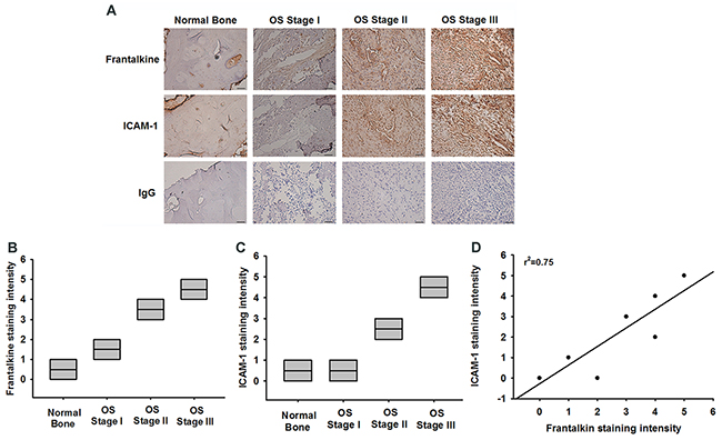 Figure 7: Fractalkine expression is significant correlated with ICAM-1 and tumor stage in osteosarcoma specimens. A. IHC photographs (Scar bar = 50 μm). The osteosarcoma specimens were stained with fractalkine and ICAM-1 antibodies by IHC staining. B and C. The staining intensities of fractalkine and ICAM-1 were scored from 1-5 and quantified to show fractalkine and ICAM-1 expression levels in different tumor stages. D. Positive correlation between fractalkine and ICAM-1 expression levels in osteosarcoma specimens. Data are expressed as the mean ± SEM.