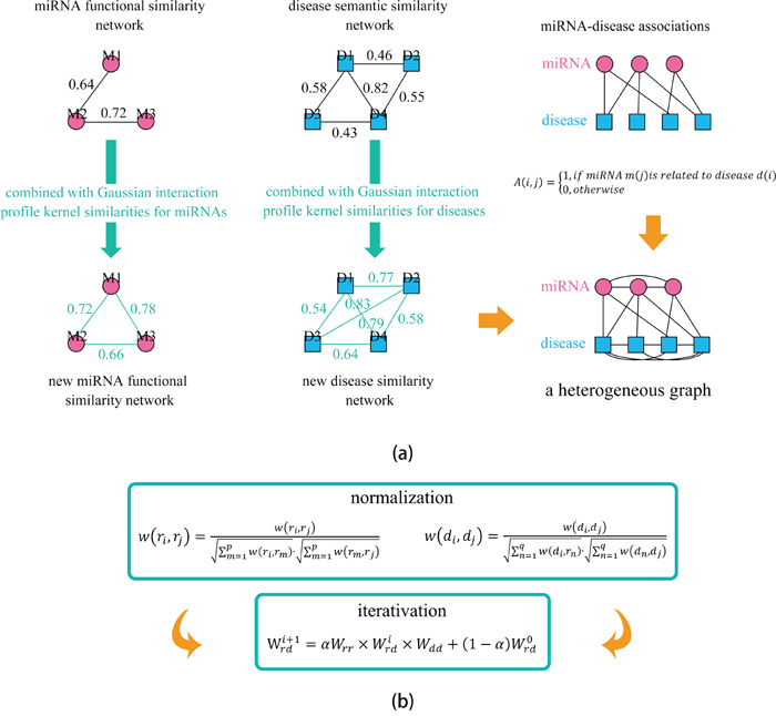 Figure 1: Flowchart of potential disease-miRNA association prediction based on the computational model of HGIMDA. a. Constructing the heterogeneous graph by integrating miRNA functional similarity, disease semantic similarity, Gaussian interaction profile kernel similarity, and experimentally verified miRNA-disease associations; b. Predicting potential miRNA-disease associations based on an iterative equation and obtaining the stable association probability.