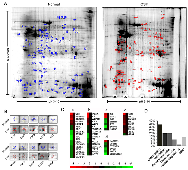 Figure 1: Proteomic identification of differently expressed proteins between normal and OSF tissue. A. Representative 2-DE gel images of human normal and OSF tissues. The protein extracts were separated on the pH 3-10 nonlinear IPG strips and followed with 12% SDS-PAGE in the second dimension, then visualized by CBB staining. 2-D gel images were analyzed by PDQuest software and the protein spots were labeled with numbers. B. Representative spots with changed density. C. Protein cluster analysis was performed by using Cluster software. Expression of proteins in the normal tissues was constantly set as 0. Meanwhile proteins up-regulated and down-regulated in the OSF tissue are in red and green, respectively. The intensity of the color red or green is correspondent to the level of differentiation according to the color strip. D. 88 identified proteins were classified into six groups according to their function.