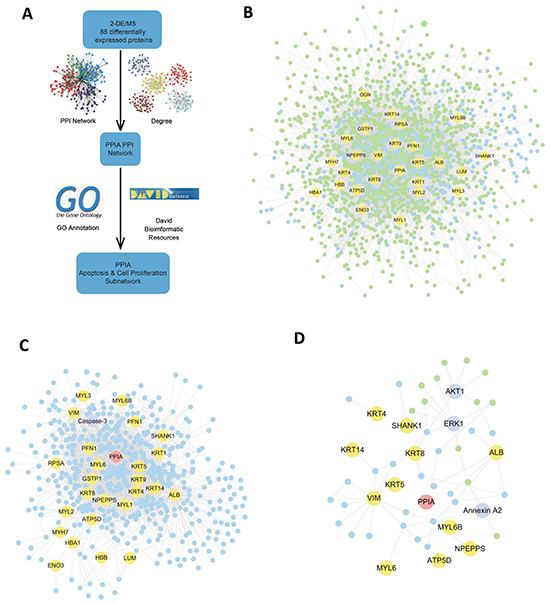 The protein-protein interaction (PPI) network was conducted based on the identified proteins, and biological evidence was collected from PrePPI [47]. And then, network associated proteins were classified into 10 groups according to the GO (Gene Ontology) Annotation clustering. The network group analysis was conducted via DAVID database and each functional group contains at least 100 proteins (http://david.abcc.ncifcrf.gov/) [48]. The proliferation and apoptosis associated subnetworks were identified. Cytoscape was used to integrate the unified conceptual framework of PPI network [49, 50]. Pathway annotations (derived from Kyoto encyclopedia of genes and genomes) and GO associated biological process were used for functional categories analysis. The functional annotations analysis was conducted via gene ontology tool (GOTERMCCALL) and proteins with p<0.05 (Fisher’s exact test) significance would be collected in the list.
