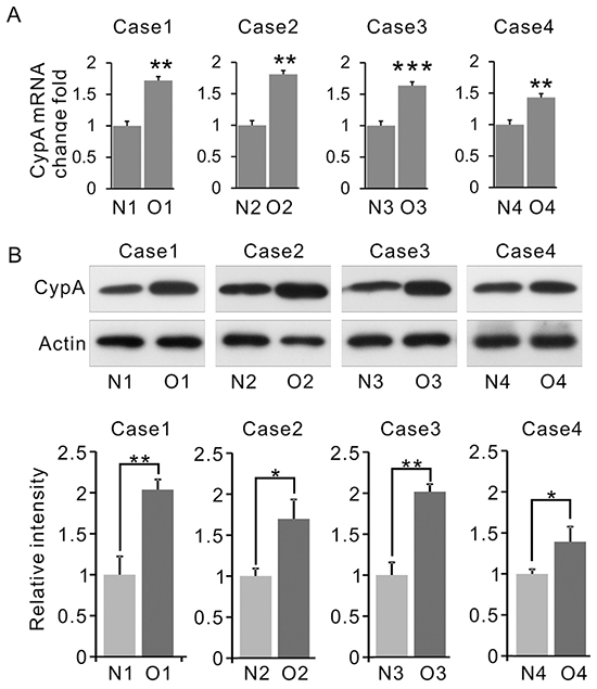 The statistical results are presented as mean ± standard deviation (S.D.) and all of the statistical analyses were repeated at least three times. ANOVA test was used to analyze the CypA expression level between different stages of OSF; Mann-Whitney test was used to analyze whether the different expression level; Spearman correlation study was used to analyze the relation between CypA expression level and OSF occurrence; Least square method was used to analyze the relation between CypA expression level and progression of different stage of OSF; Pearson correlation test was used to analyze the correlations between CypA and Annexin A2; Further, we calculated the odds ratio (OR) to validate the carcinogenesis rate of OSF. The mean values were compared by student’s test and the significance was defined as *p<0.05, **p<0.01, ***p<0.001. All of the statistical analysis were conducted by SPSS 19.0.