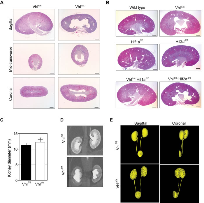 Figure 1: Loss of Vhl causes Hif1a-dependent non-obstructive hydronephrosis. A. H&E stainings of different section planes of adult kidneys with a renal epithelial cell-specific deletion of Vhl. B. Overview pictures of Vhl, Hif1a, Hif2a, Vhl/Hif1a and Vhl/Hif2a deficient kidneys. C. Measurement of kidney size in vivo based on D. Two-dimensional μCT images of control (Vhlfl/fl) and Vhl-deficient kidneys (VhlΔ/Δ). E. Three-dimensional reconstruction of μCT images of kidney, ureter and bladder. Scale bars = 1 mm.