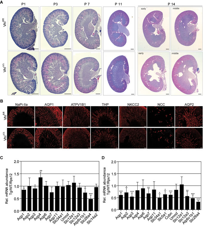 Figure 2: Hydronephrosis in Vhl-deficient mice forms between postnatal days 11 and 14. A. H&E stainings of Vhl-deficient kidneys at postnatal day 1, 3, 7, 11 and 14. Scale bars = 500 μm. B. Immunofluorescent staining of depicted renal proteins in kidneys of 14 day-old mice. Scale bars = 200 μm. C.-D. mRNA abundance of indicated genes in Vhl-deficient kidneys of (C) 11 day-old mice or (D) adults. Mean ± std.dev, n = 6 animals per genotype. Gene expression ratios between Ksp1.3-Cre and wild type (WT) mice, normalized to the expression of Rps12.