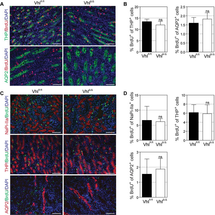 Since genetic loss of Vhl has previously been shown to cause senescence or reduce proliferation of various mouse cells [29-31] we further investigated whether Vhl deletion in highly proliferating epithelial cells may cause subtle cellular proliferative phenotypes that affect the formation of the nephron. We labelled S-phase cells in kidneys in 7 day-old mice by BrdU injection and identified thick ascending loops of Henle and collecting ducts by co-staining with antibodies against THP and AQP2, respectively. No differences in the percentage of proliferating cells in these tubule segments were observed between wild type and VhlΔ/Δ kidneys (Figure 3A-3B). Similarly, marking S-phase cells in proximal tubules (using an antibody against NaPi-IIa), thick ascending loops of Henle and collecting ducts in 14 day-old kidneys revealed no alterations in proliferation between wild type and VhlΔ/Δ kidneys (Figure 3C-3D). Taken together, we conclude that a post-natal developmental defect in the formation of the nephron is not responsible for the onset of hydronephrosis.