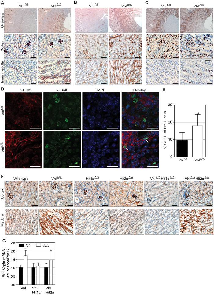 Figure 5: Stabilization of HIF-1α increases renal medullary vascularization. Immunohistochemical staining of 14 day-old kidneys of VhlΔ/Δ and control mice (Vhlfl/fl) for A. von Willebrand Factor (vWF), B. CD31 and C. Ki67. Scale bars = 200 µm (overview images) and 50 µm, n = 4. D. Representative images and E. quantification of VhlΔ/Δ kidney sections and controls stained with DAPI (blue) and antibodies against BrdU (green) and CD31 (red). Scale bars = 20 µm, mean ± std.dev, n = 6. F. vWF staining on adult kidneys of depicted genotypes. Scale bars = 50 µm, n = 4. G. mRNA abundance of Vegfa normalized to Rps12 in kidneys of the indicated genotypes (n = 6).