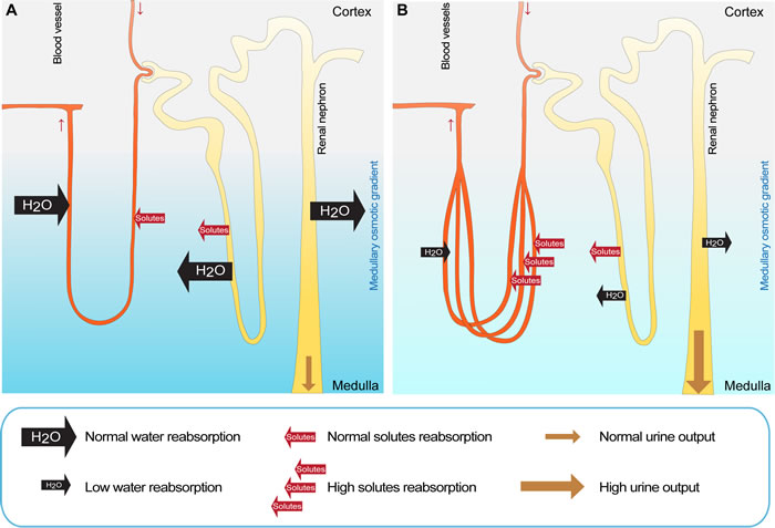 Figure 6: Proposed model explaining the diabetes insipidus phenotype in VhlΔ/Δ mice. A. In wild type mice, renal solutes are reabsorbed from the primary urine into the interstitium by a complex network of active and passive transport that generates the medullary osmotic gradient, which is the driving force for the renal water reabsorption and uptake of solutes into the blood stream. B. In VhlΔ/Δ mice, the specific stabilization of HIF-1α in renal epithelial cells causes an increased vascularization of the renal medulla, leading to an elevated absorption of solutes by the blood from the renal interstitium, thereby diminishing the medullary osmotic gradient. This prevents the efficient reabsorption of water from the renal tubules and results in excess urine production. Subsequently, the urine induces a back pressure on the kidney, causing the expansion of the renal pelvis and the formation of hydronephrosis. Increased loss of water by the urinary system in VhlΔ/Δ mice is compensated by elevated water intake to prevent dehydration.