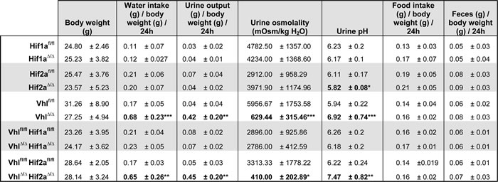Table 1: Characterization of feeding parameters of mice with renal epithelial cell-specific deletions of Vhl, Hif1a, Hif2a, Vhl/Hif1a and Vhl/Hif2a.
