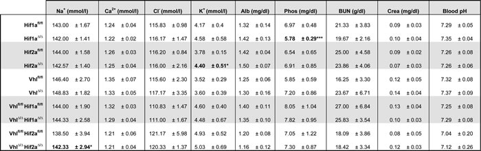 Table 2: Characterization of blood parameters of mice with renal epithelial cell-specific deletions of Vhl, Hif1a, Hif2a, Vhl/Hif1a and Vhl/Hif2a.