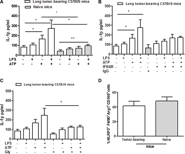 Figure 1: Lung tumor-derived macrophages release IL-1β after NLRP-3 activation. Lung TAMs release high levels of IL-1β after ATP and LPS+ATP stimulation compared to naïve lung-derived macrophages (A). The addition of LPS+ATP to IFNAR- (B) and glybenclamide-treated lung TAMs (C) significantly reduced IL-1β levels compared to cells treated with the sole LPS+ATP. (D) Flow cytometry analysis shows similar expression of NLRP3 between lung tumor- and naïve lung-derived macrophages. Data represent means ± SEM (n = 12). Statistically significant differences are denoted by *and **indicating p < 0.05 and p < 0.005, respectively, as determined by one-tailed Student’s t test.