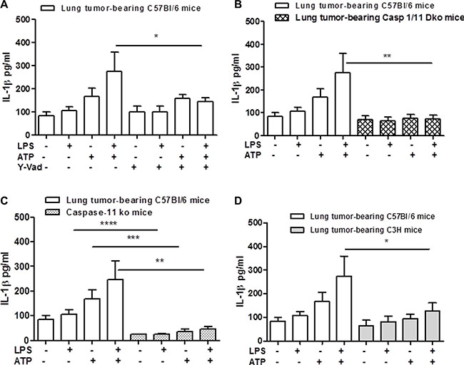 Figure 2: Caspase-1 and caspase-11 modulate IL-1β release after NLRP-3 activation in lung TAMs. The inhibition of caspase-1 by means Y-Vad (1 μg/mL) significantly reduced the release of IL-1β after LPS+ATP addition to lung TAMs (A). (B) The genetic absence of both caspase-1 and caspase-11 or of the sole caspase-11 (C) completely abrogated the release of IL-1β from lung TAMs after LPS+ATP stimulation. C3H-derived lung TAMs released reduced levels of IL-1β when LPS+ATP were added (D). Data represent means ± SEM (n = 12). Statistically significant differences are denoted by *, **, ***and **** indicating p < 0.05, p < 0.01, p < 0.005 and p < 0. 001, respectively as determined by Student’s t test.