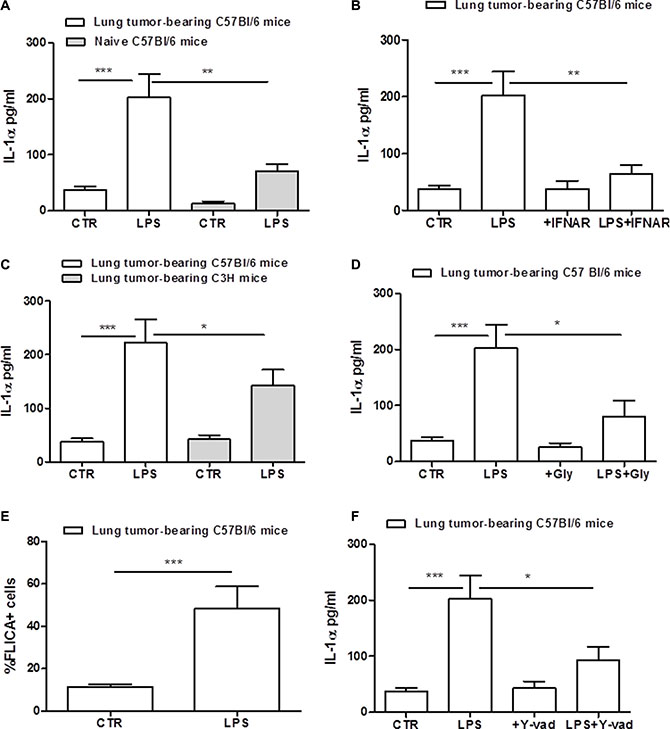 Figure 4: Lung tumor-derived macrophages release IL-1α after LPS stimulation. Lung TAMs released higher levels of IL-1α after LPS treatment compared to naïve lung-derived macrophages (A). The inhibition of type I IFN receptor (IFNAR) significantly reduced IL-1α release from lung tumor-derived macrophages after LPS stimulation (B). C3H-derived TAMs released lower levels of IL-1α levels after LPS treatment (C). The addition of LPS to glybenclamide-treated lung TAMs significantly reduced IL-1α levels compared to cells treated with the sole LPS (D). Caspase-1 activity was measured by means FAM-FLICA assay kit and expressed according to the absorbance of FLICA+ cells; lung tumor-derived macrophages shows high levels of FLICA absorbance, confirming the activity of caspase-1 after LPS administration (E). The inhibition of caspase-1 by means Y-Vad (1 μg/mL) significantly reduced the release of IL-1α after LPS addition to lung TAMs (F). Data represent means ± SEM, (n = 12). Statistically significant differences are denoted by *, **and ***indicating p < 0.05, p < 0.01 and p < 0.005, respectively as determined by Student’s t test.
