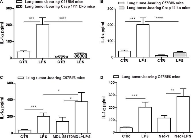 Figure 5: Caspase-11 regulates NLRP3/caspase-1-dependent IL-1α release. The genetic absence of both caspase-1 and caspase-11 completely abrogated the release of IL-1α from lung TAMs after LPS stimulation (A). Caspase-11 ko lung TAMs released significantly reduced levels of IL-1α when LPS was added (B). The inhibition of calpain system by means of MDL 28170 did not reduce IL-1α release after LPS administration (C). The administration of Necrostatin-1 did not alter LPS-induced IL-1α release from lung TAMs (D). Data represent means ± SEM, (n = 12). Statistically significant differences are denoted by *, **, ***and ****indicating p < 0.05, p < 0.01,p < 0.005 and p < 0.001, respectively as determined by Student’s t test.