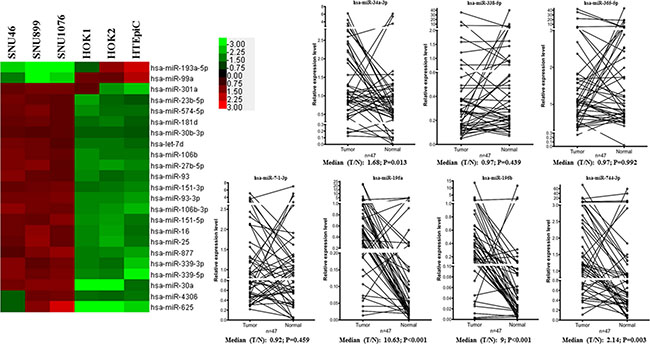 Figure 1: Deregulated microRNAs in LSCC. As shown in the heat map, 21 microRNAs overexpressed and 2 microRNAs were downregulated in LSCC cell lines respectively. The line charts showed the expression levels of the 8 differentially expressed microRNAs in LSCC tissues. MiR-196a, miR-196b and miR-744-3p were significantly overexpressed in LSCC compared with their paired normal counterparts (P < 0.05).