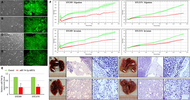 A stem-loop shRNA with imperfect complementation was constructed according to the antisense miR-744-3p sequence (5′-GACAACGGTGATTGGAGTTGGA-3′). The miR-744-3p shRNA coding sequence was cloned into lentivector pGreenPuro (System Biosciences) to generate the miR-744-3p shRNA expressing vector (pGreenPuro-miR-744-shRNA vector). PDCD4 insert for construction of stable LSCC clone expressing PDCD4 was amplified using Roche FastStart High Fidelity PCR System (Roche Applied Science). The forward primer for PDCD4 insert amplification was: 5′- GCA TAATGGATGTAGAAAATGAGCA-3′, and the reverse primer was: 5′- CGTACTCAGTAGCTCTCTGGTTTAA -3′. The PDCD4 coding sequence was cloned into lentivector pCDH-CMV-MCS-EF1-copGFP (System Biosciences) generating the pCDH-PDCD4 vector. The pGreenPuro-miR-744-shRNA or pCDH-PDCD4 vector as well as their mock vectors was further packaged into lentiviral particles by 293-FT cells (Life technologies) using the Lenti Starter Kit (System Biosciences). Subsequently, the lentiviral particles were transduced into the LSCC cell lines SNU899 and SNU1076 by TransDux™ (System Biosciences).