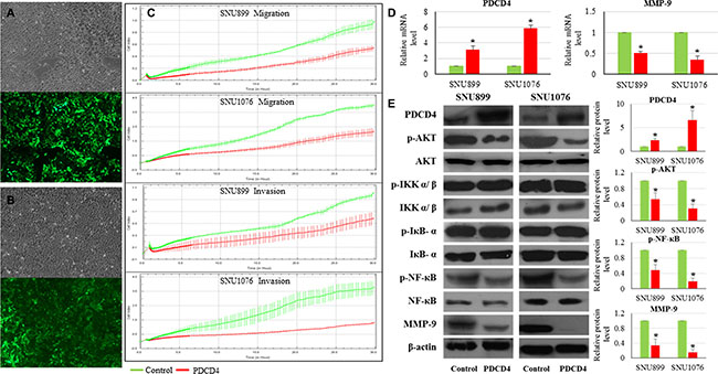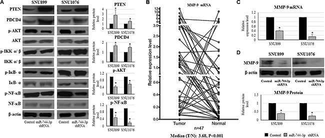 Western blot was performed using Mini-PROTEAN® Tetra Cell Systems (Bio-Rad) on 10% SDS-PAGE. Proteins were electroblotted onto polyvinylidine difluoride (PVDF) membranes (Immobilon, Millipore) by semi-dry transfercell (Bio-Rad). Membranes were incubated with PTEN (D4.3) XP® rabbit monoclonal antibody (Cell Signaling) or PDCD4 (D29C6) XP® rabbit monoclonal antibody (Cell Signaling) or Phospho-Akt (Ser473) antibody (Cell Signaling) or Akt (C67E7) Rabbit monoclonal antibody (Cell Signaling) or phospho-IKKα/β (Ser176/180) (16A6) rabbit monoclonal antibody (Cell Signaling) or phospho-IκBα (Ser32/36) (5A5) mouse monoclonal antibody (Cell Signaling) or NF-κB p65 (L8F6) mouse monoclonal antibody (Cell Signaling) or IKKα/β (H-470) rabbit polyclonal antibody (Santa Cruz) or IκB-α (C-21) rabbit polyclonal antibody (Santa Cruz) at 1:1,000 dilution, or phospho-NF-κB p65 (Ser536) (93H1) rabbit monoclonal antibody (Cell Signaling) or MMP-9 (D6O3H) XP® Rabbit monoclonal antibody (Cell Signaling) at 1:500 dilution, or beta-actin specific antibody (Sigma-Aldrich) at 1:10,000 dilution at 4°C overnight. Signals were developed using chemiluminescence Plus Western Blotting Detection System (Amersham) and analyzed using ImageJ software version 1.48 (http://rsbweb.nih.gov/ij/).