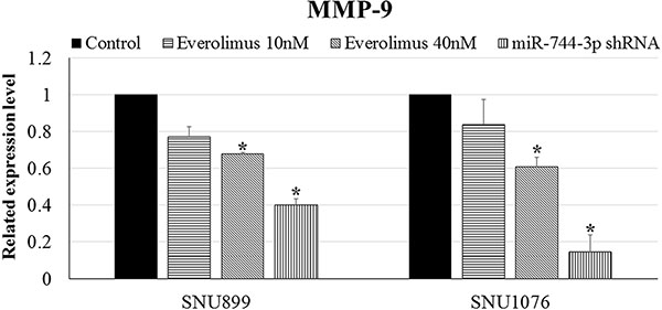 In order to identify the key functional microRNA in LSCC, we performed microRNA profiling in LSCC cell lines using microRNA microarray and validated the results in LSCC tissues. We found that deregulation of miR-744- 3p was a common event in LSCC. At present, however, its functions in LSCC remains to be defined. In silico analysis showed that miR-744-3p could directly target the mRNA transcript of both programmed cell death 4 (PDCD4) and phosphatase and tensin homolog (PTEN), both of which had been reported to be correlated with LSCC metastasis [11–13]. Reduced PDCD4 was usually found in aggressive head and neck cancers [14]. PDCD4 knock-out mice showed high systematic dissemination rate implying the functional implication in the metastatic process [15, 16]; PTEN, on the other hand, was a well-known anti-neoplastic factor [17], which antagonized the action of PI3K by converting PIP3 to PIP2 via dephosphorylation [18]. Both PTEN and PDCD4 were identified as the upstream suppressors of matrix metallopeptidase 9 (MMP-9) which facilitated cancer cell migration through degrading the collagenous substrates in the surrounding extracellular matrix [19]. Our results revealed a novel pathway employed by LSCC in promoting LSCC migration and metastasis by overexpressing miR-744-3p.