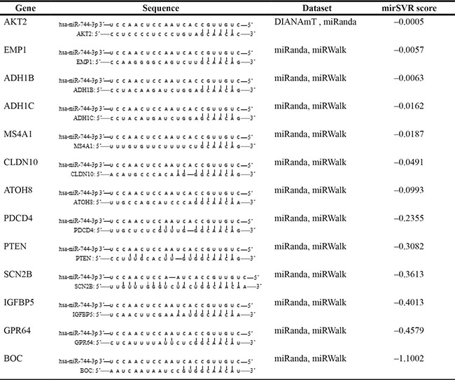 MiRWalk (http://www.umm.uni-heidelberg.de/apps/zmf/mirwalk/) was used to predict the candidate transcripts which are targeted by miR-744-3p [52]. MiRWalk retrieves predicted target gene lists from 12 databases (DIANA-microTv4.0, DIANA-microT-CDS, miRanda-rel2010, mirBridge, miRDB4.0, miRmap, miRNAMap, PicTar2, PITA, RNA22v2, RNAhybrid2.1 and Targetscan6.2). Mature miR-744-3p sequence, MIMAT0004946 was used in the computational analysis. Genes simultaneously reported by 2 or above databases were selected. In addition, gene list was generated from literature. Genes reported to be downregulated in LSCC were selected and generate the second gene list. The common genes in the 2 gene lists were further filtered using the machine learning regression method mirSVR scoring method, which measures the likelihood of target mRNA down-regulation by the microRNA from sequence and structure features in microRNA/mRNA predicted target sites [53]. A lower mirSVR score implies a greater likelihood of the downregulation of potential target genes due to specific microRNA. Gene with a mirSVR score less than –0.01 was selected for subsequent validation.