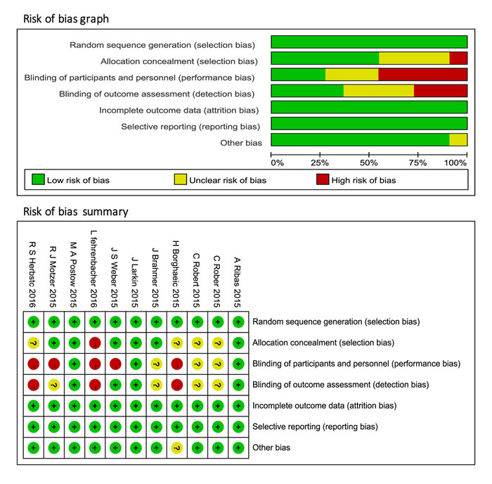 We assessed the quality of involved randomized controlled clinical trials according to the criteria presented in the Cochrane Handbook for Systematic Reviews of Interventions (version 5.1.0; chapter 8), and evaluated the random sequence generation, allocation concealment, blinding of participants and personnel, blinding of outcome assessment, incomplete outcome data, selective reporting and other bias to ensure the low-risk of bias of the studies included.