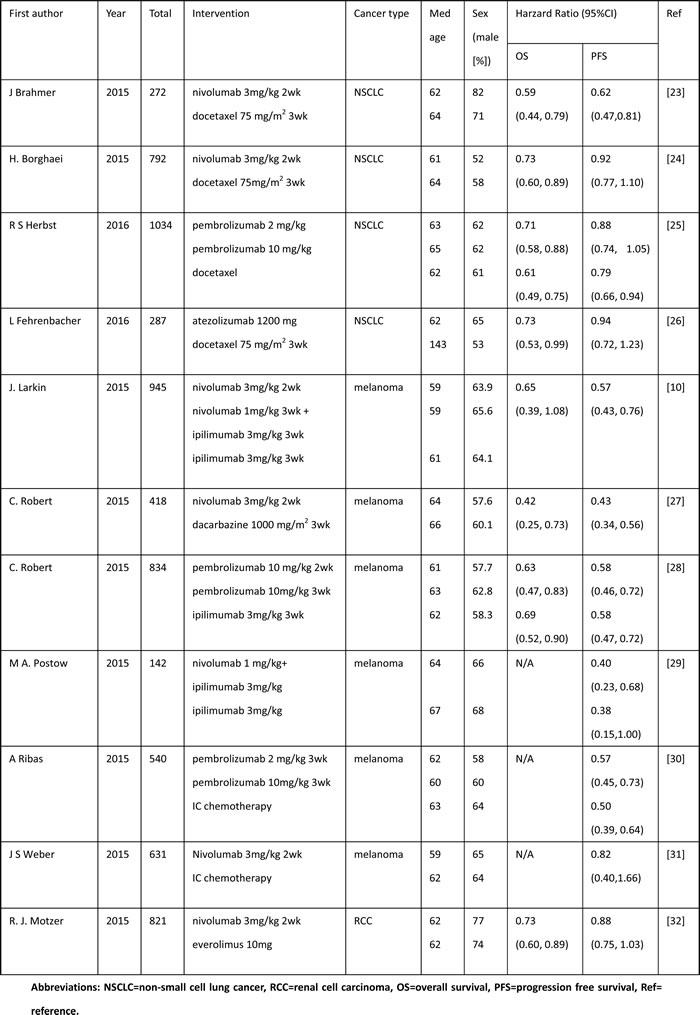 The analyses were based on data from a total of 6716 patients enrolled in 11 randomized controlled trials. The experimental treatment drugs of those trials were PD-1/PD-L1 blockades, including nivolumab, pembrolizumab and atezolizumab, while the controlled interventions were standard chemotherapy (docetaxel, dacarbazine, etc), targeted therapeutic agents (everolimus) and other form of immunotherapy (ipilimumab). According to currently completed trials focused on epithelial carcinoma, all randomized controlled trials were conducted within melanoma, NSCLC and RCC patients. 6 of the enrolled trials were in melanoma patients (n = 3510), 4 in NSCLC patients (n = 2385), and 1 in RCC patients (n = 821). 3 of the trials were phase 2 trials, 1 was phase 2/3 trial, and 7 were phase 3 trials.