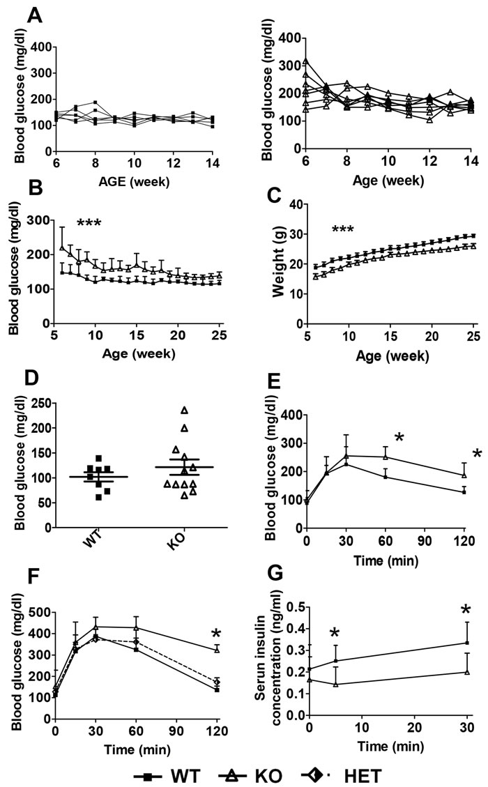 Mice were subjected to glucose tolerance test at 8-10 weeks of age. Mice were fasted overnight (16 hours) and intraperitoneally injected with 0.9% NaCl solution containing D-glucose at the dose of 1 or 2g/kg body weight. Blood samples for glucose measurements were taken at 0, 5, 10, 15, 30, 60 and 120 minutes after the glucose load. Serum was also collected at 0, 5, 30 minutes after glucose load, insulin concentration was detected using mouse insulin ELISA Kit (Crystal Chem Inc.,